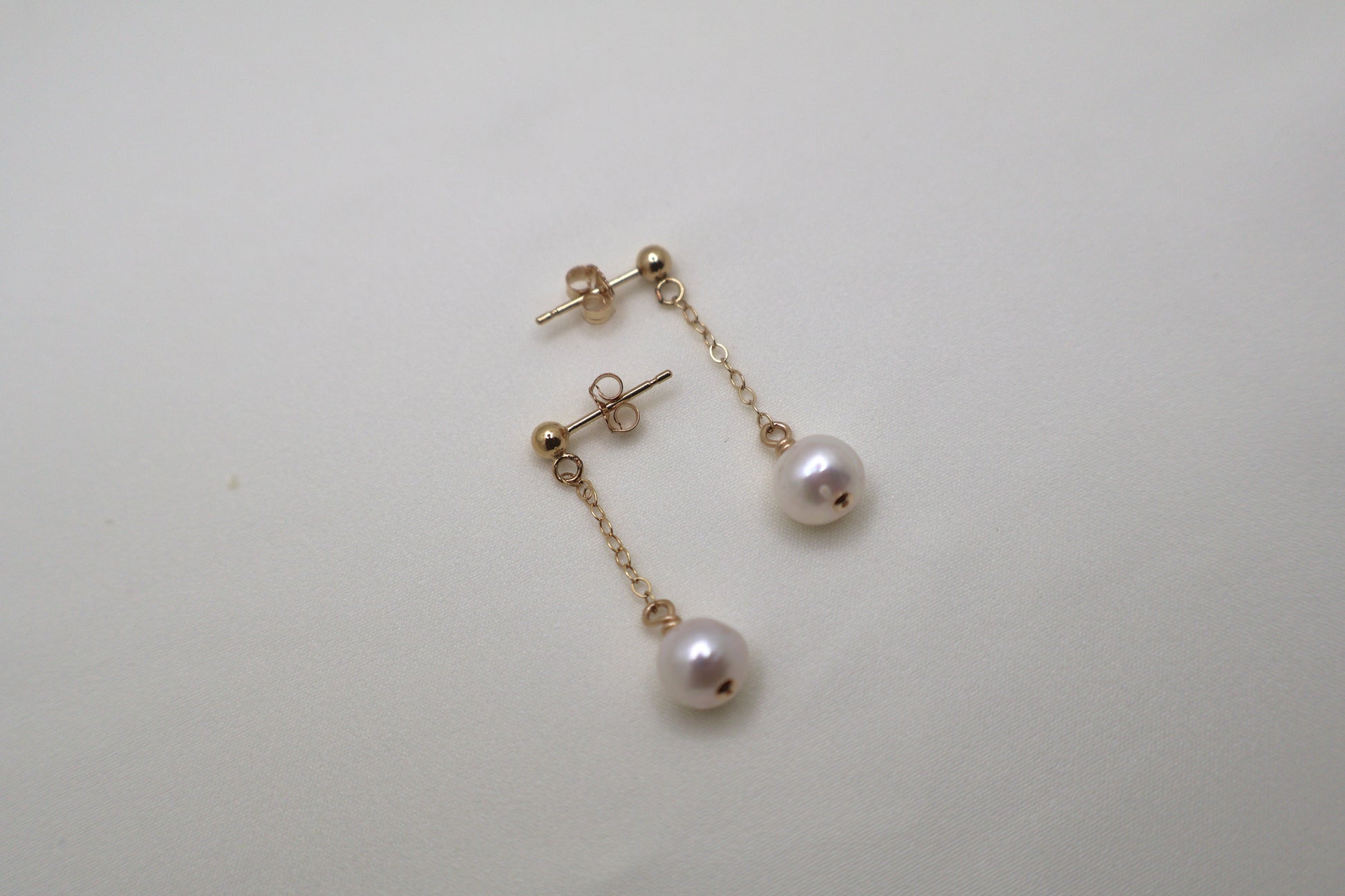 The Camilla Earrings, each side with a single freshwater pearl drop. Their refined simplicity adds a timeless touch to your look.
